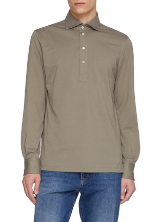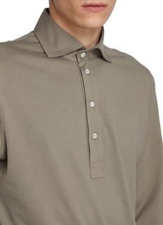 This Brunello Cucinelli long-sleeve polo shirt is the epitome of refined casualwear. Crafted from a luxurious cotton blend, this shirt offers a soft touch and enduring comfort. Its muted olive tone provides a versatile base for any wardrobe, pairing seamlessly with everything from tailored trousers to relaxed denim.