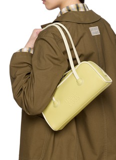 This Mini Soft Baguette bag from Margesherwood features a timeless combination of light green and off-white leather piping, offering a fresh take on classic design. Perfect for adding a pop of colour to your everyday wardrobe.